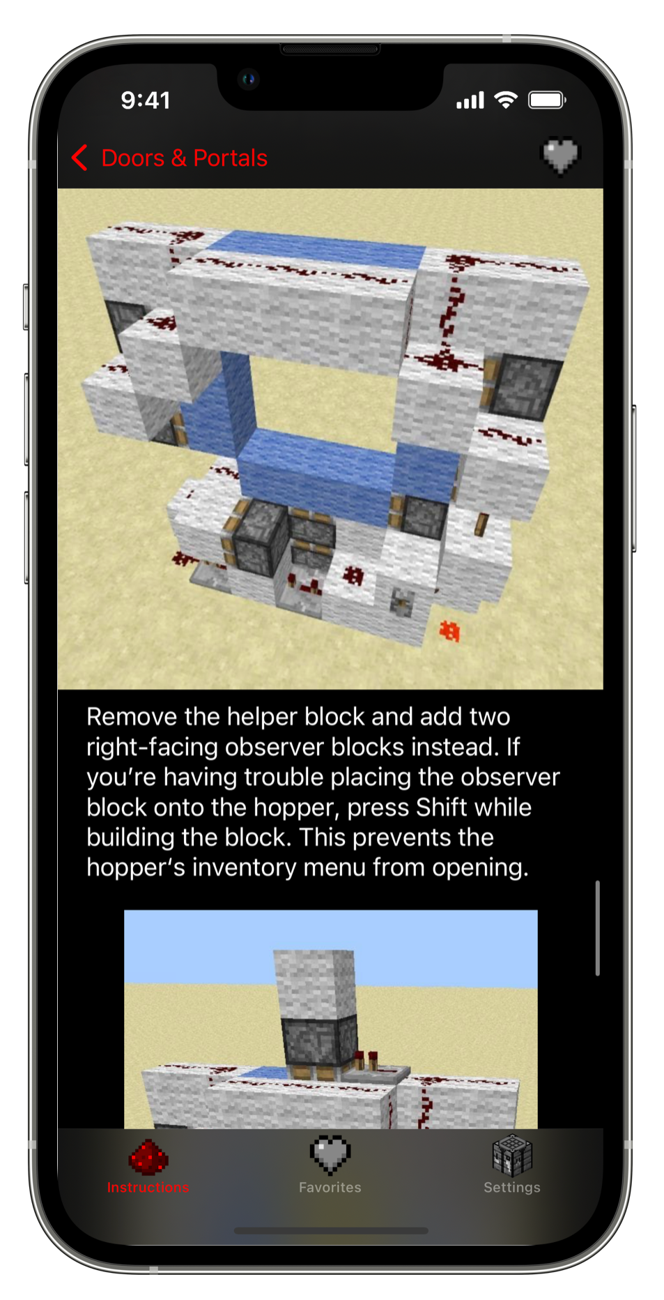 No need to pause and resume any tutorial videos – scroll through the build instructions at your own pace without switching back and forth between YouTube and Minecraft.